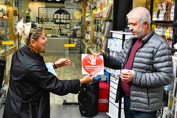 Kadın ve Aile Hizmetleri Daire Başkanlığı ekipleri, erkek esnaflara toplumsal cinsiyet eşitliği ve kadına yönelik şiddet konularında sorular sorarken, iş yerlerinin girişlerine farkındalık amacıyla stickerlar asıldı.