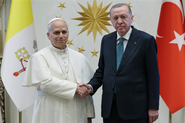 Saygıdeğer Papa 14. Leo'yu ve heyetini ülkemizde misafir etmekten büyük bir memnuniyet duyuyorum. Bir kez de sizlerin huzurunda kıymetli misafirimiz ve heyetine ülkemize hoş geldiniz diyorum. Kendilerinin göreve başladıktan sonra ilk yurt dışı seyahatini Türkiye'ye gerçekleştirmesini her bakımdan çok anlamlı buluyorum.
