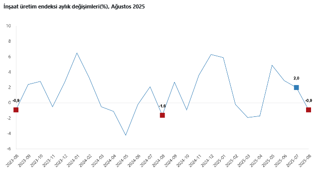 İnşaatın alt sektörleri incelendiğinde, Ağustos'ta bina inşaatı sektörü endeksi aylık bazda yüzde 1,5 azalırken, bina dışı yapıların inşaatı sektörü endeksi yüzde 1,5 arttı ve özel inşaat faaliyetleri sektörü endeksi yüzde 0,2 azaldı.