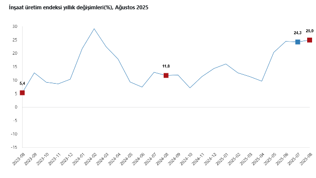 Türkiye İstatistik Kurumu’nun (TÜİK) verilerine göre, inşaatın alt sektörleri incelendiğinde, Ağustos'ta bina inşaatı sektörü endeksi yıllık bazda yüzde 26,6, bina dışı yapıların inşaatı sektörü endeksi yüzde 17,4 ve özel inşaat faaliyetleri sektörü endeksi yüzde 25,1 arttı.