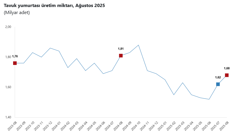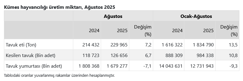 Ocak-Ağustos döneminde bir önceki yılın aynı dönemine göre, tavuk yumurtası üretimi yüzde 9,3 geriledi, kesilen tavuk sayısı yüzde 10,8 yükseldi, tavuk eti üretimi yüzde 13,5 yükseldi.
