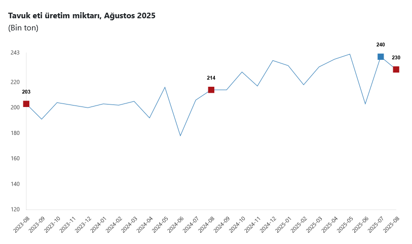 Bir önceki ay 239 bin 876 ton olan tavuk eti üretimi Ağustos ayında yüzde 4,1 azalışla 229 bin 965 tona geriledi.